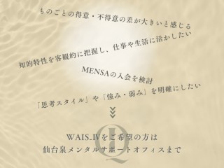 仙台泉メンタルサポートオフィスは、このたび、大人向けの知能検査「WAIS-Ⅳ(ウェクスラー成人知能検査)」を用いた自己分析サービスを、仙台市泉区で本格的に提供開始しました。