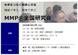 一般社団法人日本観光文化協会(東京都北区赤羽西1-22-15 大亜コーポ:会長 小塩稲之)は、連携する日本販路コーディネータ協会及びMMP総合研究所と2026年1月17日(土) に東京都中央区銀座の中小企業会館にて第25回全国研究会を開催します。
