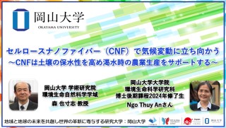 国立大学法人岡山大学(本部:岡山市北区、学長:那須保友)の学術研究院環境生命自然科学学域の森 也寸志教授と大学院環境生命科学研究科博士後期課程2024年修了生のNgo Thuy Anさんは、植物由来の新材料・セルロースナノファイバー(CNF)を使うと土壌の保水性が高まり、渇水で灌漑水が減少しても、健全な植物生長を促せることを発見しました。