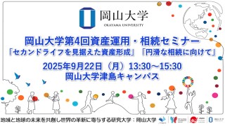国立大学法人岡山大学(本部:岡山市北区、学長:那須保友)の学都基金室では、2025年9月22日(月) に本学津島キャンパスの創立五十周年記念館において「第4回資産運用・相続セミナー」を開催します。