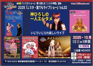 10月12日(日) の「Jスタ・誰でもライブショー」Vol.32は、神ひろしと大久保千代太夫のライトコメディー「二人のマリリン・モンロー」はじめ、「女優」・ナンセンスコント「モンローちゃん」他、エキサイティングな神ひろしワールドをご覧頂きます。