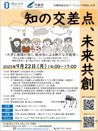 国立大学法人岡山大学(本部:岡山市北区、学長:那須保友)は、内閣府とともに2025年9月22日(月) に「内閣府総合知ワークショップ@岡山大学 知の交差点、未来共創-大学と地域が拓く、総合知による新たな可能性-」を、本学津島キャンパスの共創イノベーションラボ(KIBINOVE:きびのべ)とオンラインでのハイブリッド形式で開催します。