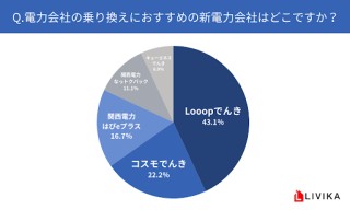暮らしを豊かにするお役立ち情報メディア「LIVIKA」(https://livika.jp/)では、実際に電力会社を乗り換えた500人を対象に「乗り換え先に選んだ新電力会社」についてアンケート調査を実施しました。その結果、「Looopでんき」が堂々の1位に選ばれました。