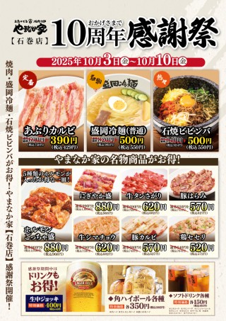 「焼肉冷麺やまなか家 石巻店」では、2025年10月3日(金) より石巻店限定「10周年感謝祭」を開催いたします。