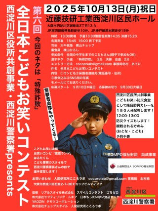 西淀川区役所共創事業第6回全日本こどもお笑いコンテストではゲストに大阪府警察音楽隊がやってきます!この日は12:00から西淀川区役所共創事業こどもお笑い防災食堂として防災カレー150人分無料でふるまいます!そして今回の漫才ネタは「特殊詐欺」こどもたちがどんなネタで仕上げてくるか今から楽しみです!!