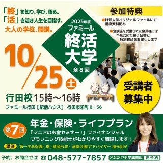 そこで、行田セレモニーグループでは、地元の葬儀会社として、会員の皆様が終活の正しい情報と知識を学ぶ「ファミール終活大学」を開講します。
