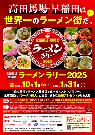 高田馬場・早稲田ラーメンラリー実行委員会(所在地:新宿区高田馬場/実行委員長岡本匡弘)は、東京地下鉄株式会社(本社:台東区上野)、高田馬場・早稲田エリアの地域メディア「ジモア」編集部と共催で、2025年10月1日 〜2026年1月31日 まで「高田馬場・早稲田ラーメンラリー2025」を開催します。 都内有数のラーメン激戦区とされる高田馬場・早稲田エリアのラーメン、つけ麺、油そばなどの店舗や東京メトロの駅、商業施設を舞台に「ラーメンで、人と店と街をつなぐ」をコンセプトに、日本人の国民食でもあるラーメンを通して「街の魅力をまるごと楽しむ」街巡りイベントです。