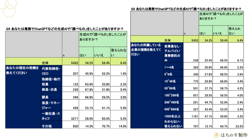 調査の結果、業務で生成AIを使って「調べ物」をしたことがある人は全体5,452名の34.2%にのぼりました。