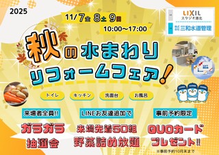 株式会社三和水道管理(本社:神奈川県横浜市)は、2025年11月7日(金) ・8日(土)・9日(日)の3日間、LIXILの体験型施設(横浜市都筑区)にて「三和水道管理 2025秋のリフォームフェア」を開催いたします。