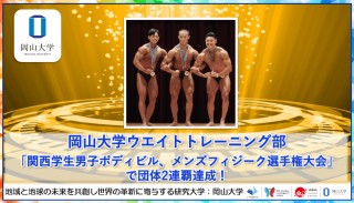 国立大学法人岡山大学(本部:岡山市北区、学長:那須保友)のウェイトトレーニング部は、2025年9月15日 に阪南大学GYCホール(大阪府)で開催された「第60回関西学生男子ボディビル選手権大会」、「第6回関西学生メンズフィジーク選手権大会」に出場し、団体2連覇を果たしました!さらにボディビルでは濱野光さん(工学部3年)が2位、森東優さん(工学部4年)が3位、メンズフィジークでは森東さんが1位に輝きました。