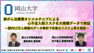 国立大学法人岡山大学(本部:岡山市北区、学長:那須保友)の岡山大学病院薬剤部の建部泰尚薬剤師、田中雄太副薬剤部長、岡山大学学術研究院医療開発領域薬剤部の座間味義人教授(岡山大学病院薬剤部長)らの研究グループは、日本の大規模医療データベースに含まれる肺がん患者約12万人分のデータを解析し、EGFR変異陽性の非小細胞肺がんの治療薬である「オシメルチニブ」を使用する患者さんでは、他の治療薬を使う患者さんと比較して心不全で入院するリスクが2倍以上高いことを明らかにしました。加えて、特に高齢者や治療開始前に高血圧、心房細動、心不全、慢性腎臓病といった疾患がある患者さんでは、より心不全入院のリスクが高い可能性が示されました。