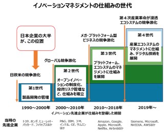 さらに本書は、イノベーションマネジメントの歴史的発展を、第1〜第4世代に整理し、欧米企業がこの仕組みを、どのように進化させてきたかを示します。第1世代はStage-Gateによる管理型モデル、第2世代はP&GやIBMが確立したオープンイノベーション、第3世代はGAFAが推進するエコシステム型、第4世代はDX・デジタルツインを活用した産業全体連携モデルです。ところが、多くの日本企業は、未だに第1世代にとどまり、イノベーションを「新事業創出」と「現場効率化」に分断して捉えており、成果を限定していると指摘しています。