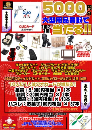 お買い物現金払い・大型用品買取でQUOカードが当たる!「きっずえんじぇる安佐店」がダブルキャンペーンを開催