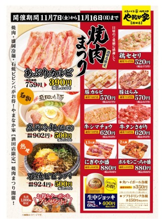 東北NO.1の出店数を誇る「焼肉冷麺やまなか家 」では、2025年11月7日(金) より「酒田焼肉まつり」を酒田店限定開催いたします。