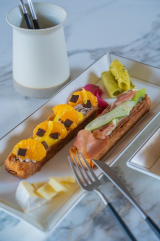 このたびのスティッククロワッサンは、「シトラス&ショコラ」と「キウイ&生ハム&モッツアレラチーズ」という趣の異なる2種類を1つのプレートで提供します。「シトラス&ショコラ」は、コクと風味豊かなベルギーチョコホイップと、柑橘の大トロと言われる「せとか」を使用したクリームを搾り、みかん・国産柚子皮・カカオ分58%のクーベルチュールを乗せ、濃厚なチョコレートと柑橘の酸味を組み合わせました。爽やかな香りと甘み・苦みのバランスを楽しむことができます。「キウイ&生ハム&モッツアレラチーズ」は、アボカドやニンニク、スパイスをブレンドしたワカモレを乗せ、みずみずしいキウイの酸味と、モッツァレラのやさしいコク、スペイン産生ハムの深い旨みが重なり合い、甘み・酸味・塩味のバランスが心地よい一品に仕上げました。この2種類にアルコールと一緒に楽しめるよう、チーズの盛り合わせ・リガトーニのジェノベーゼ・レッドオニオンのピクルスを付けたプレートとしました。