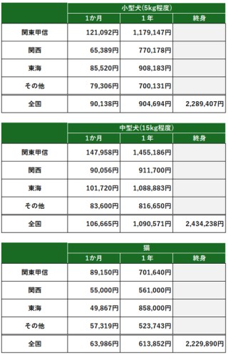・終身お預かり料金は採用施設が少数のため、全国平均のみ算出