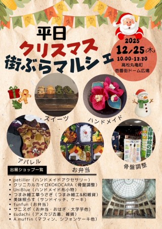 『クリスマス街ぶらマルシェ』を高松丸亀町壱番館ドーム広場にて初開催します。 ご家族やお友達と一緒に平日まったりと街ぶらを楽しんでみてはいかがでしょうか。 2日間ステキなお店が出店されますよ。 美味しいグルメが楽しめます♪