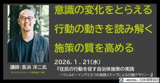 2026年1月21日(水) 、一般社団法人日本経営協会が主催する行政管理講座、『住民の行動を促す自治体施策の実践 〜ウェルビーイングと5つの実践ステップによる行動デザイン〜』で、代表)長浜が講師を務めます。