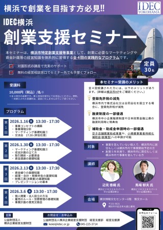 マーケティングや資金計画・収支計画等の、事業を継続していくために必要な経営知識を習得できる全4回のセミナーです。横浜で創業をお考え、創業したばかりでしっかり経営を学びたい方はぜひご参加ください!
