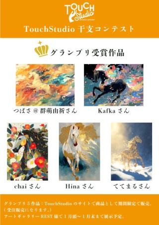 特許技術「フレスコグラフィックシート」によって、思わず触れたくなる凹凸と、絵の具がそこに残っているかのようなタッチ感を再現した《TouchStudio 干支コンテスト グランプリ作品》とのコラボレーション展示を開催します。