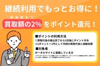 ※すでにポータルサイトにご登録いただいている場合でも、ポイントサービス開始後に初めてご契約いただいた方は「初回取引」として買取額の2%を付与いたします。
