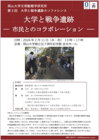 国立大学法人岡山大学(本部:岡山市北区、学長:那須保友)高等先鋭研究院の文明動態学研究所(RIDC)は、2026年2月11日(水) 13:00~17:00に第2回大学と戦争遺跡カンファレンス「大学と戦争遺跡-市民とのコラボレーション-」を、本学津島キャンパスの岡山大学創立五十周年記念館金光ホールで開催します。