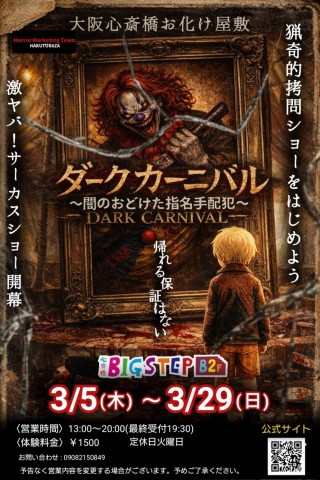 大阪の心斎橋アメ村のランドマークである商業施設「心斎橋ビッグステップ」の地下2F特設会場にアメリカロサンゼルスからやって来た、恐怖の激ヤバサーカス団が手掛ける「サーカスショー」が開幕!!立ったままサーカスを鑑賞するショー形式の新感覚お化け屋敷にあなたの心は耐えられるか??