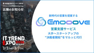 新時代の営業手法を提案する株式会社Emooove(本社:東京都品川区、代表取締役CEO:藤澤諒一)は、株式会社イノベーション(東証グロース 証券コード3970)のグループ会社である、株式会社Innovation & Co.(本社:東京都渋谷区、代表取締役社長:幸 哲史、以下「Innovation & Co.」)が主催する業界最大級のオンライン展示会「ITトレンドEXPO2026 Spring」に出展します。