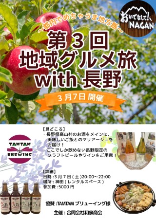 合同会社和泉商会(本社:東京都港区、代表:海野 甲太郎)がTAMTAMブリューイング様と2026年3月7日(土) に神田にて地域グルメ旅with長野〜都内でめちゃうま地方飯〜を開催します。