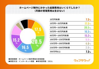 「ホームページ制作にかかった総額費用はいくらでしたか?」と質問したところ、『30万円〜50万円未満』が20.5%で最多となりました。次いで『10万円〜30万円未満』が17.5%、『50万円〜80万円未満』が16.5%と続きました。