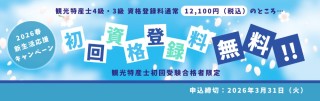 全国観光特産士会は観光特産士4級・3級合格者対象とした初回資格登録無料キャンペーンを実施します。観光特産士検定は毎年6月と11月の年2回実施されるもので、合格者には申請書の提出と資格登録料25,300円(税込)(初回資格登録料12,100円、年間登録料13,200円)を支払うことで、観光特産士資格認定証(カード)を発行しています。本キャンペーンは2026年6月7日(日) に実施される観光特産士検定受験者のうち、観光特産士4級及び3級の試験合格者に限り通常初回資格登録料12,100円(税込)を免除するものです。2026年3月31日(火)までに受験申込した方が対象です。