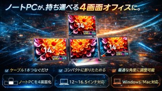 FOPO S780Proは、ノートPCの左右と上に3つのモニターを追加できるポータブル型モニターです。ノートPC本体の画面を含めると最大4画面となり、資料確認、文章作成、Web閲覧、会議などを同時に進めやすくなります。Type-C 1本で接続しやすく、折りたたみ式で持ち運びも可能。Windows 10 / 11、2019年以降のMacにも対応しています。
