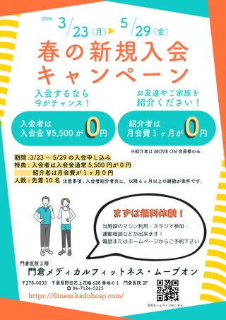 千葉県野田市の「門倉メディカルフィットネス ムーブ オン - MOVE ON」は、2026年3月23日(月) から5月29日(金) までの期間、地域の方々の健康づくりを応援する「お友達紹介キャンペーン」を実施いたします。