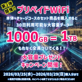 『プリペイドWiFi専用端末』+『プリペイドWiFiチャージコース』のセット商品をご購入いただくと、もれなく「1000GB/30day」をセットでプレゼント。
