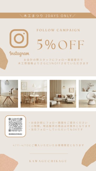 イベント期間中は、展示商品・展示外商品ともに10〜30%OFFの特別価格で販売する。Instagramフォロー画面の会計時提示で追加5%OFFも適用される。このほか、チェアのアウトレット品および数量限定のお買い得商品も会場に用意する。