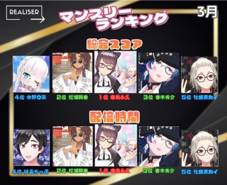株式会社ファンスター(東京都渋谷区)が運営するVライバー事務所「REALISER(レアリゼ)」が、所属するVライバーの2026年3月 度のマンスリーランキングを発表致しました。活躍するVライバーの皆様を応援宜しくお願い致します。