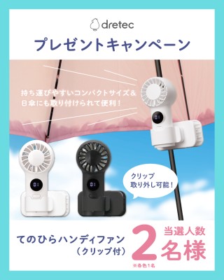 計量機器をはじめとする家電・医療機器の企画・開発および販売等を行う株式会社ドリテック(本社:埼玉県川口市、代表取締役社長:千倉悟朗、以下「ドリテック」)は、傘やポールなどに取り付けてハンズフリーでも使える「てのひらハンディファン(クリップ付)」(品番:FN-209)の発売を記念して、2026年4月8日(水) 12:00よりInstagramでのプレゼントキャンペーンを実施いたします。