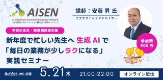 株式会社JMC(本社:東京都港区、代表取締役社長:松田 憲明)は、一般社団法人AIイノベーション&次世代教育ネットワーク(以下、AISEN)と共同で、2026年5月21日(木) に『新年度で忙しい先生へ 生成AIで「毎日の業務が少しラクになる」実践セミナー』を開催いたします。